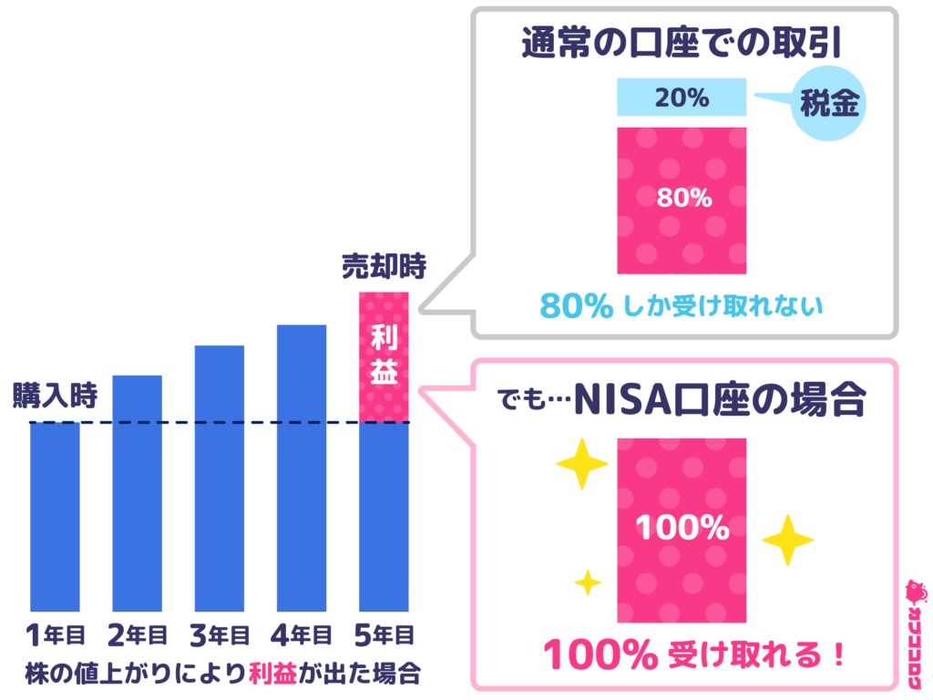 それに比べて、NISA制度を利用して作った口座で株取引をした場合、なんとこの20%の税金が免除されます!