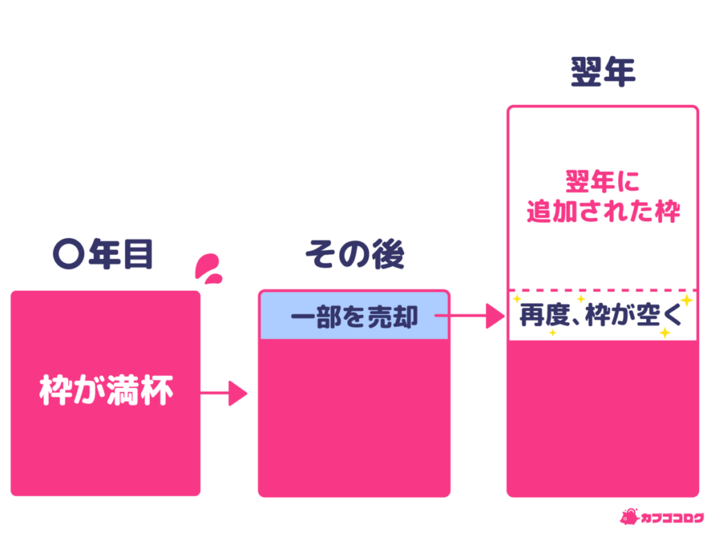 売買後にすぐに枠が空くわけではなく、「翌年に」というのが鍵になるので、計画的に枠内で売買して運用しようと考えている方は注意してください。
